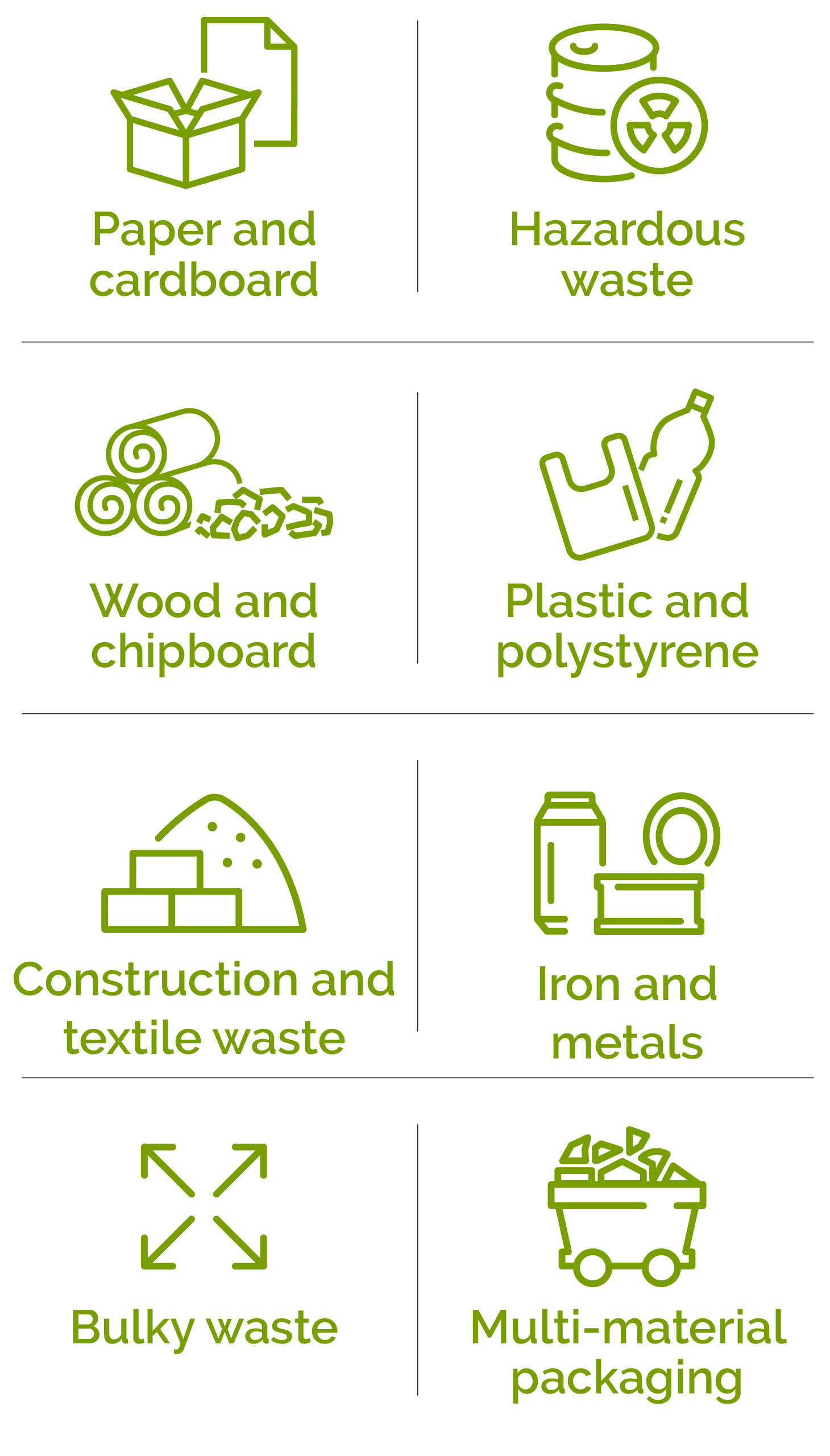 Rags, offcuts, and fabric scraps from textile furnishing and clothing companies, as well as rock wool, membranes, rubble, glass, and other materials generated as waste by construction companies and building sites.